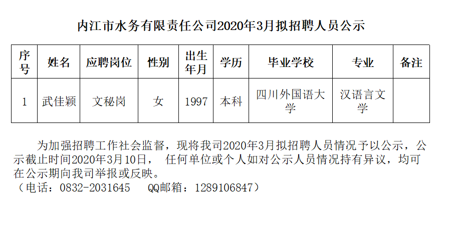 內江市水務有限責任公司2020年3月擬招聘人員公示