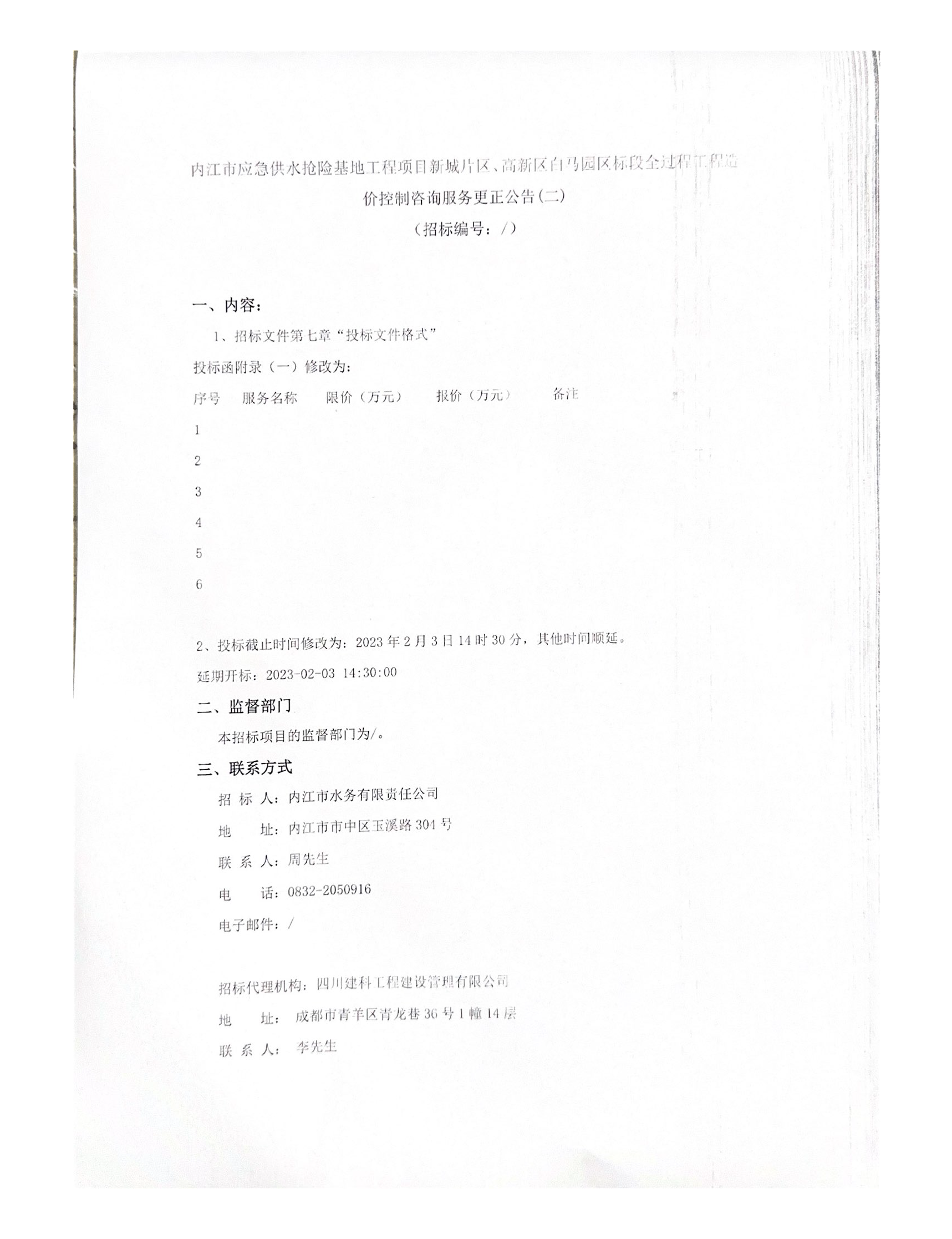 內江市應急供水搶險基地工程項目新城片區、高新區白馬園區標段全過程工程造價控制咨詢服務更正公告(二)