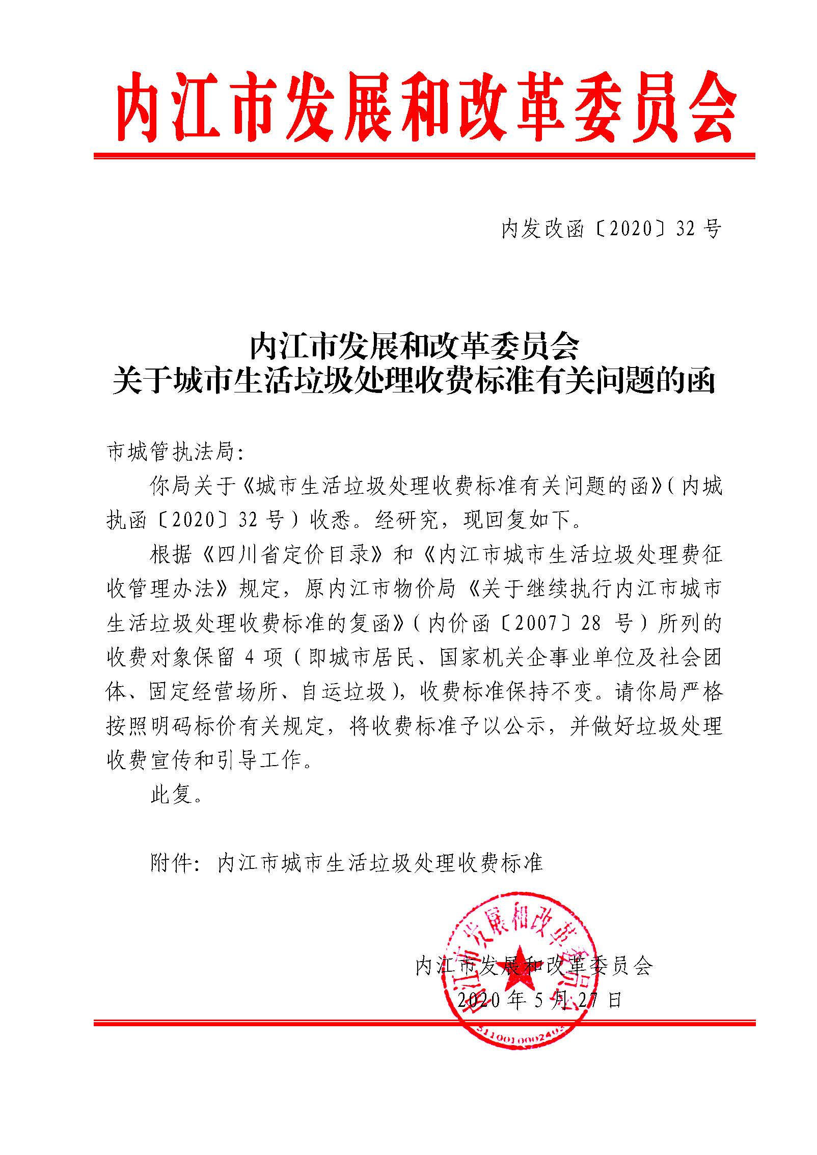 內(nèi)江市發(fā)展和改革委員會關于城市生活垃圾處理收費標準有關問題的函