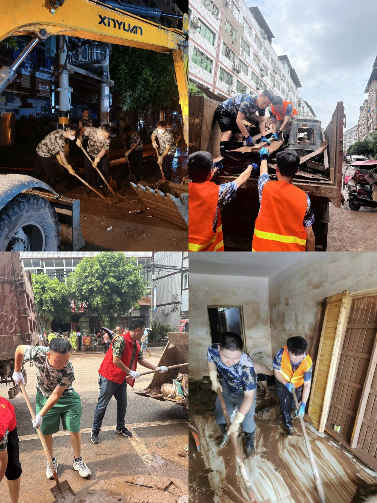 為盡快讓場鎮居民恢復到正常生活秩序中,突擊隊員們加班加點開展清淤工作。洪水將電網設備沖毀,我們便派出應急供電車發電照明,確保清淤工作順利推進。