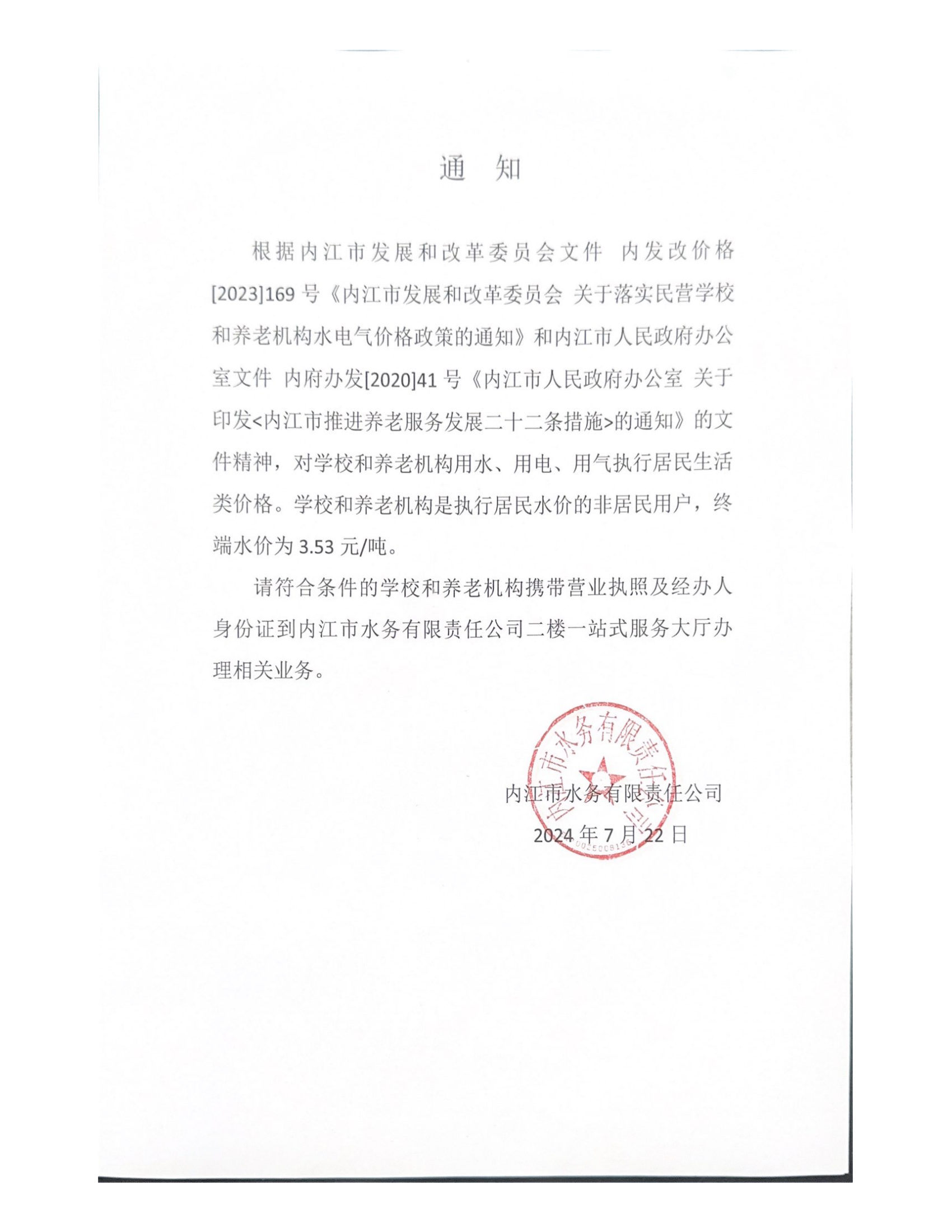 內江市水務有限責任公司關于養老機構、學校執行生活用水價格的通知