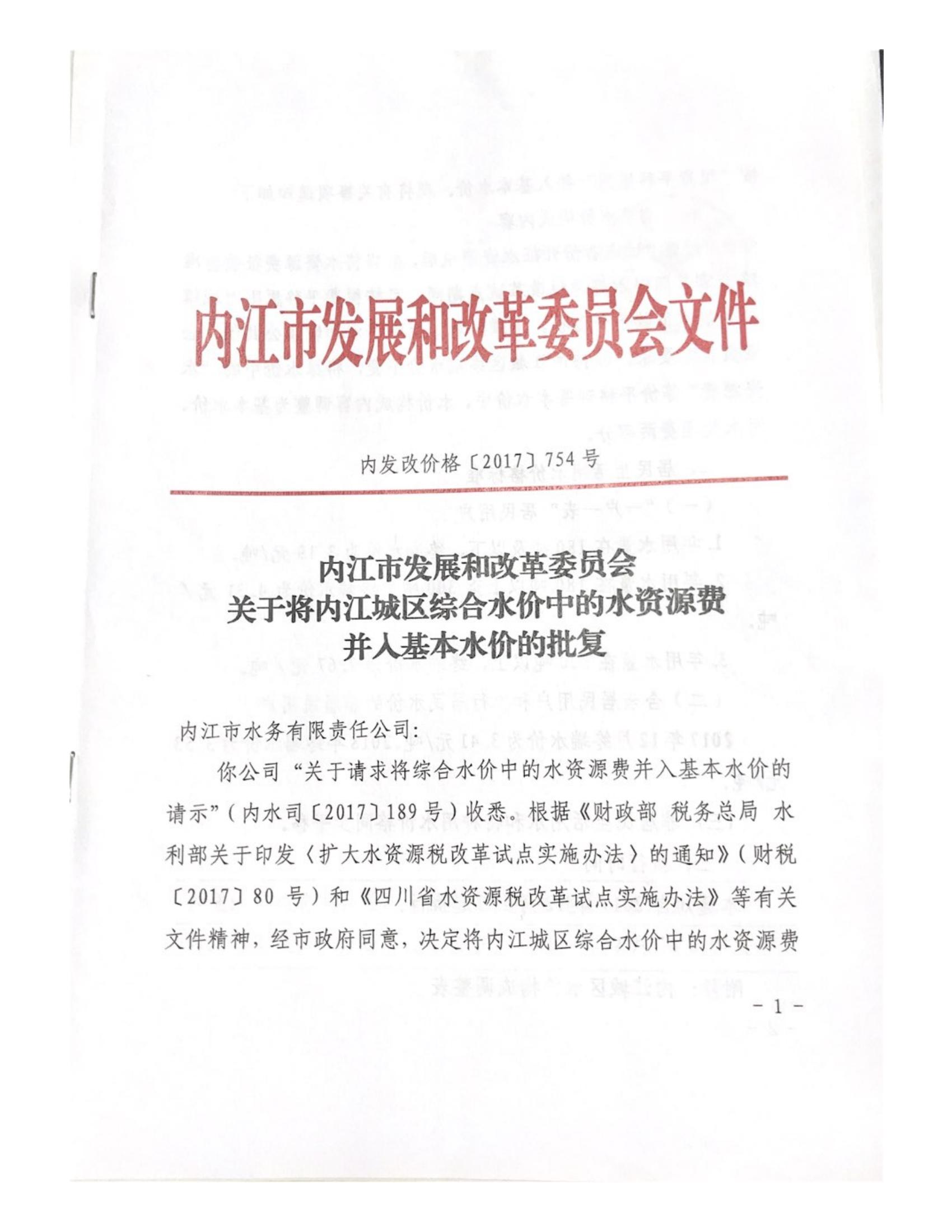 內江市發展和改革委員會關于將內江城區綜合水價中的水資源費并入基本水價的批復